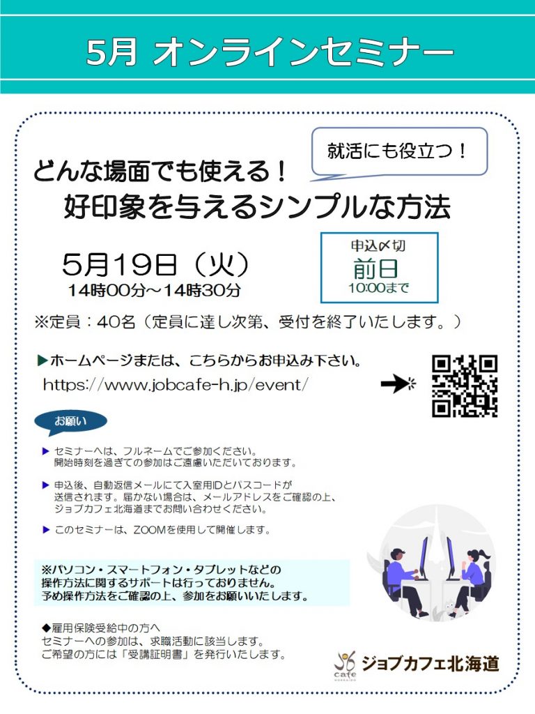 【オンライン】5月19日(火)どんな場面でも使える!好印象を与えるシンプルな方法 14:00~14:30