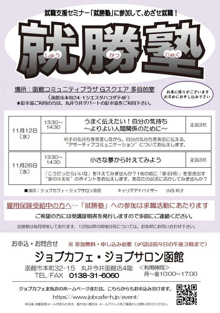 【函館・対面】11月26日(水)就勝塾 小さな夢から叶えてみよう 13:30~14:30