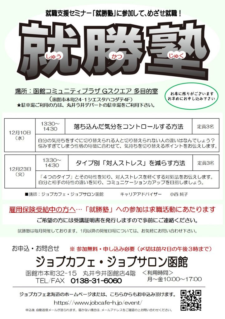 【函館・対面】12月23日(火)就勝塾 タイプ別「対人ストレス」を減らす方法 13:30~14:30