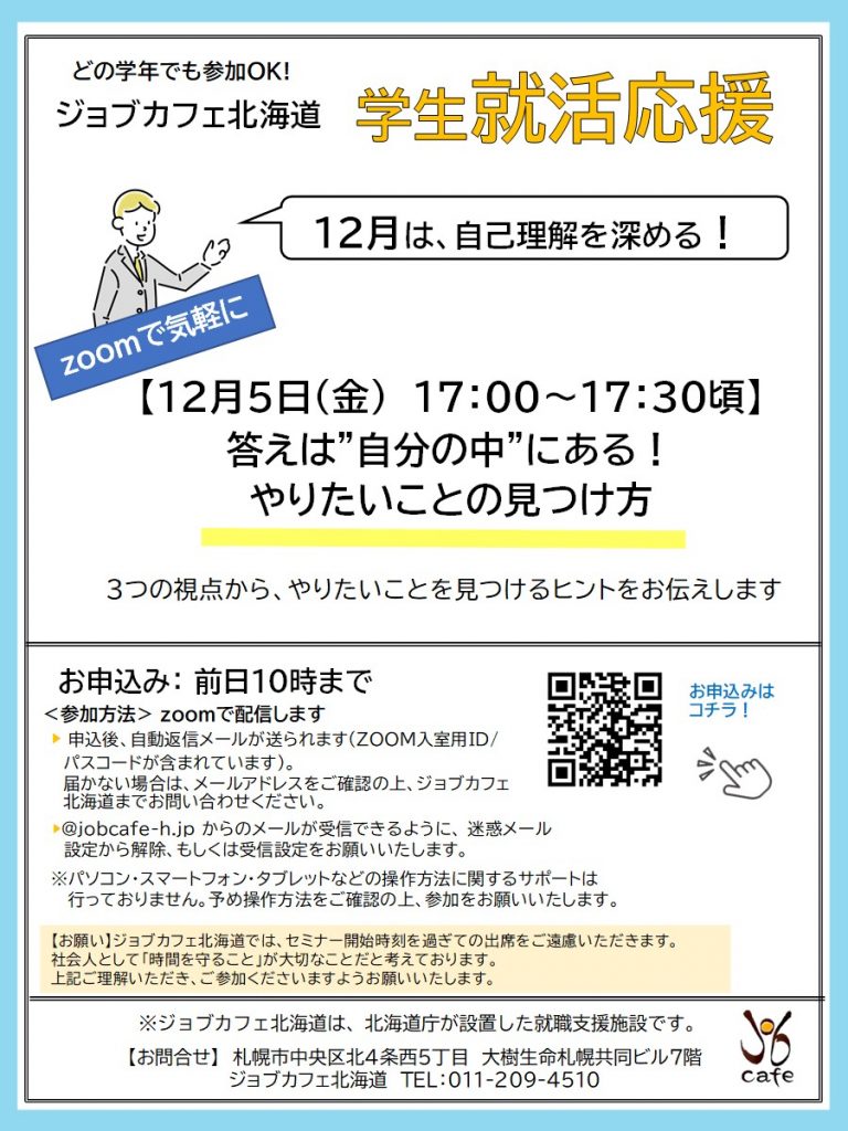 【学生就活応援・オンライン】12月5日(金) 答えは”自分の中”にある!やりたいことの見つけ方 17:00~17:30