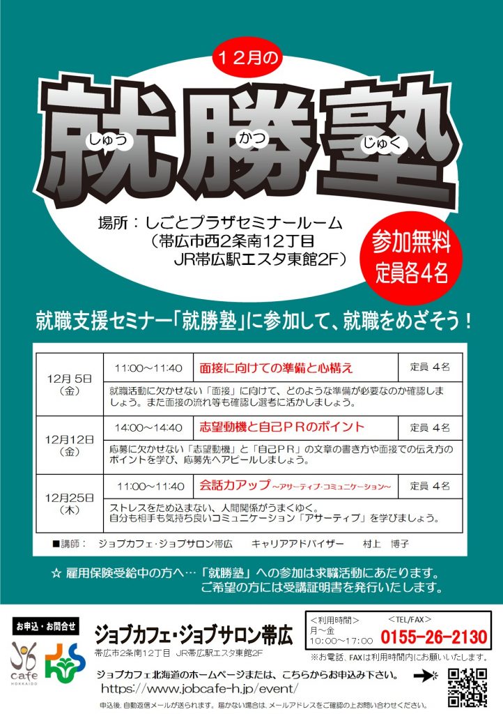【帯広・対面】12月25日(木) 就勝塾 会話力アップ~アサーティブ・コミュニケーション~ 11:00~11:40