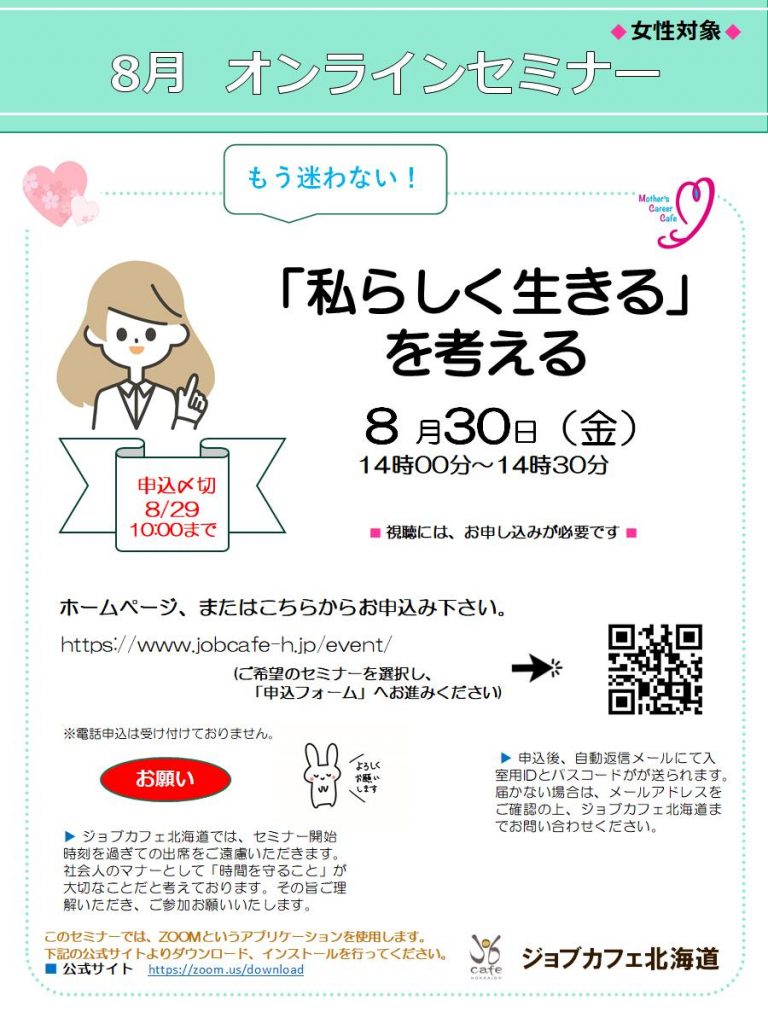 【札幌・オンライン】8月30日(金)もう迷わない!「私らしく生きる」を考える 14:00~14:30