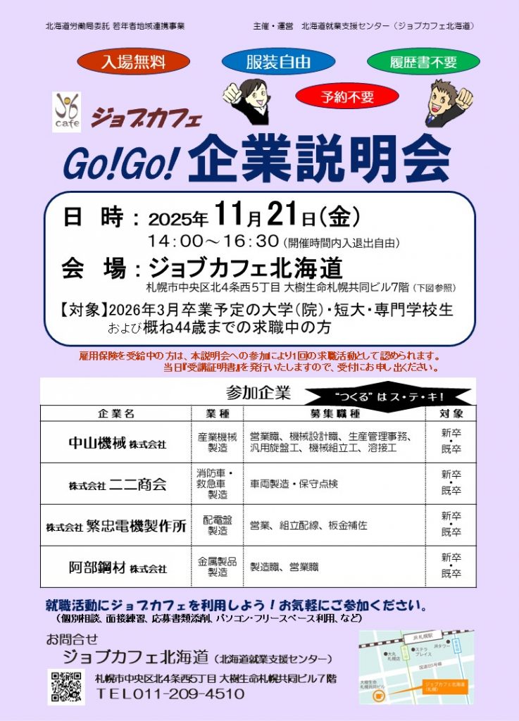 【札幌・対面】11月21日(金) 14:00~16:30 Go!Go!企業説明会