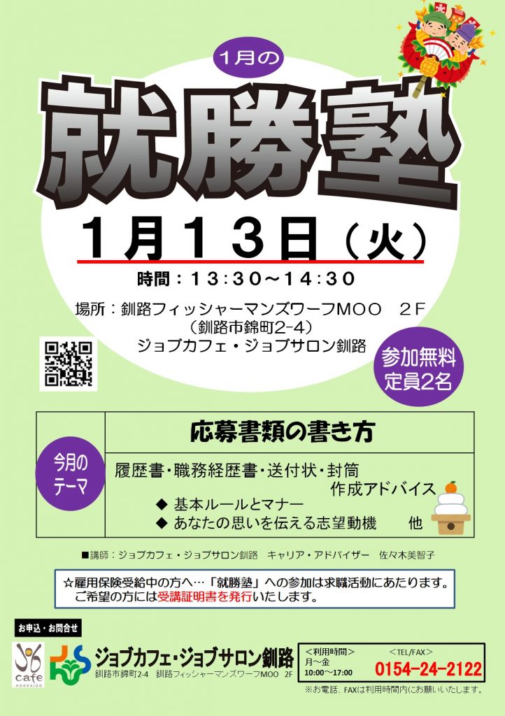 【釧路・対面】1月13日(火)就勝塾 応募書類の書き方 13:30~14:30