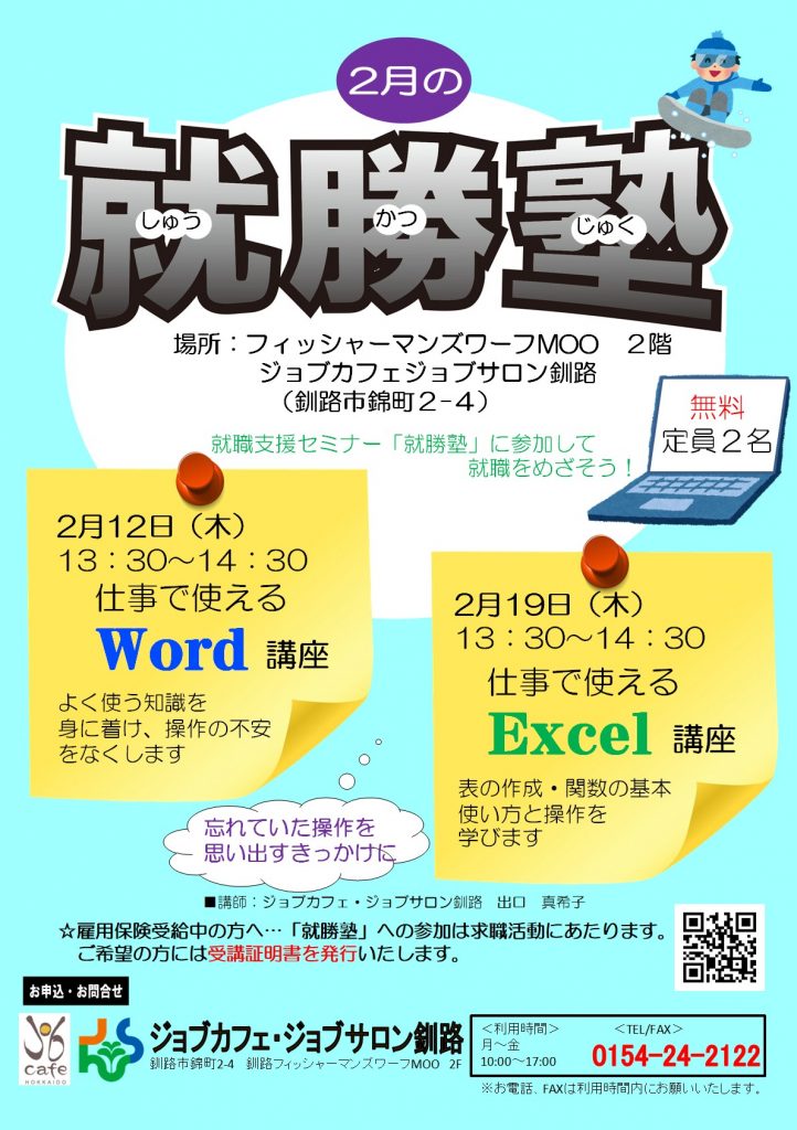 【釧路・対面】2月12日(木)就勝塾 仕事で使えるWord講座 13:30~14:30